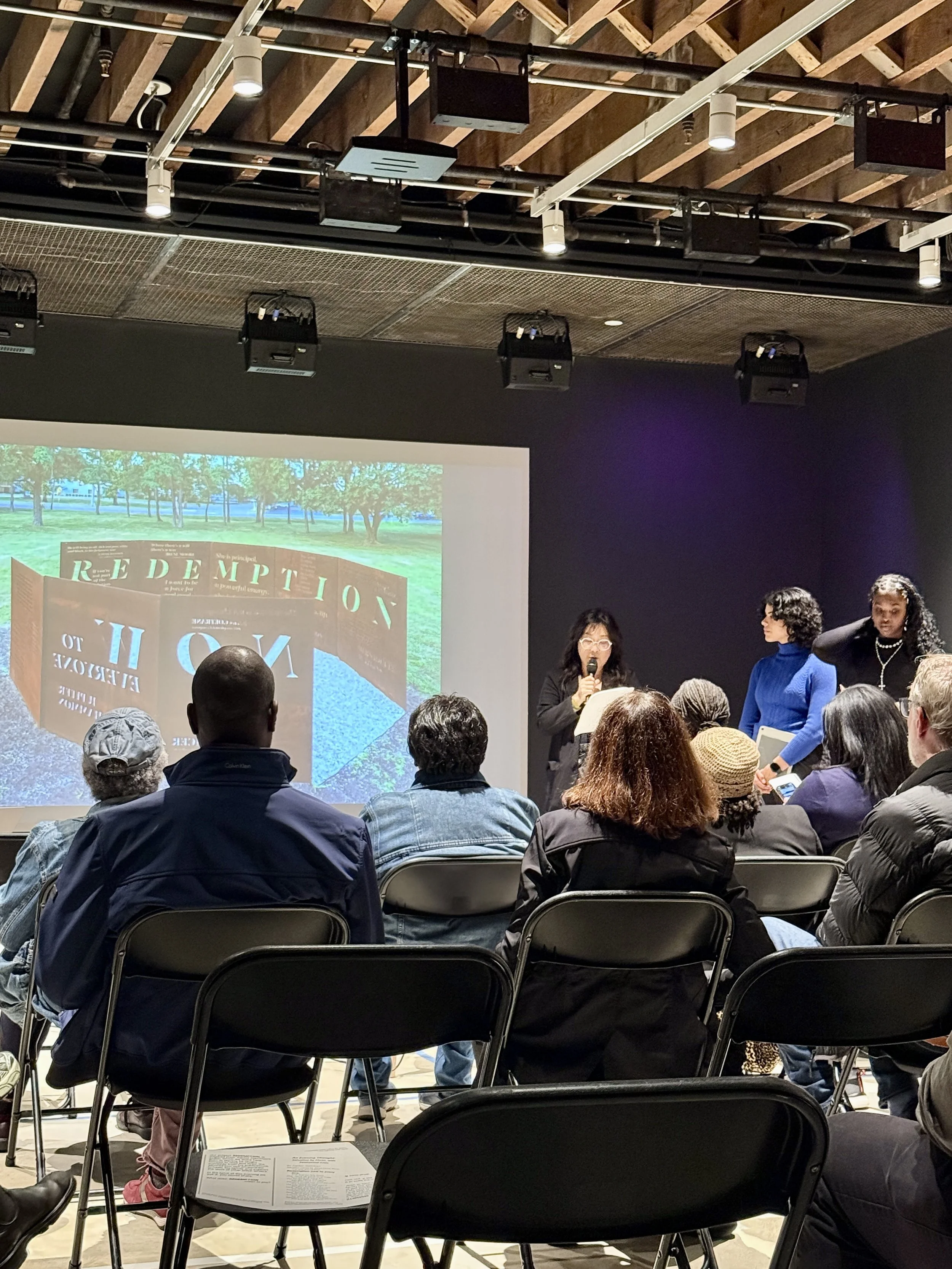 GRACE ONG YAN, principal of collective, presented “Redemption: Public Art for Community Voices” at New York’s Archtober festival at Williamsburg Biannual. She presented with Andrew Hart, co-principal, and students Polina Filipova, Leila Moutawakil, Anita Esin, and alumnus Elena Nestico. Sponsored by Community Design Collaborative, the event included an introduction by Irene Shum, co-founder and curator of Williamsburg Biannual, a presentation of the project by collective, and a panel discussion with Tya Winn, Executive Director of Community Design Collaborative, and Scott Ruff, Co-Executive Director of The Coles House Project and Adjunct Professor at Pratt Institute. A lively discussion ensued with Huntington community members in attendance. A prompt about what Redemption meant to the audience resulted in meaningful comments about hope and resilient in the current polarizing climate. A special thank you to Williamsburg Biannual leadership— Jorge Zapata, Irene Shum, Goil Amornvivat, and Tom Morbitzer who generously provided us with a beautiful venue for the event.